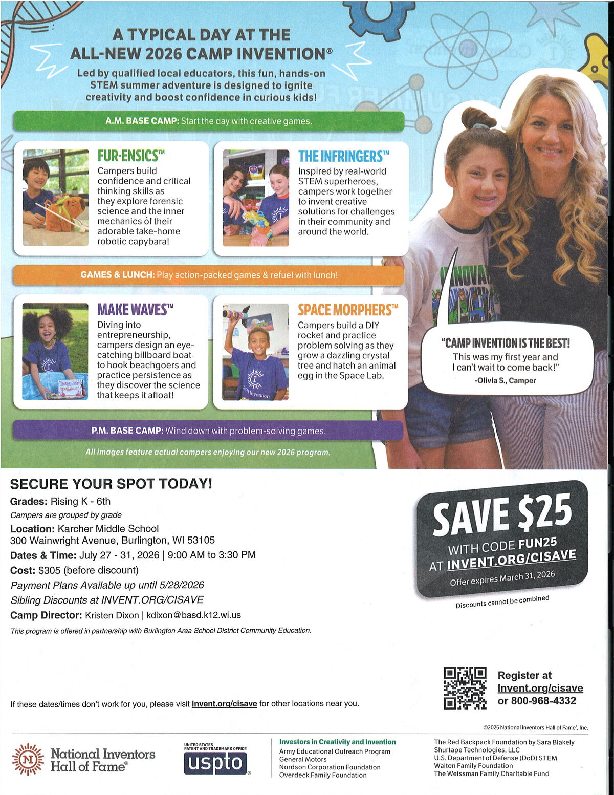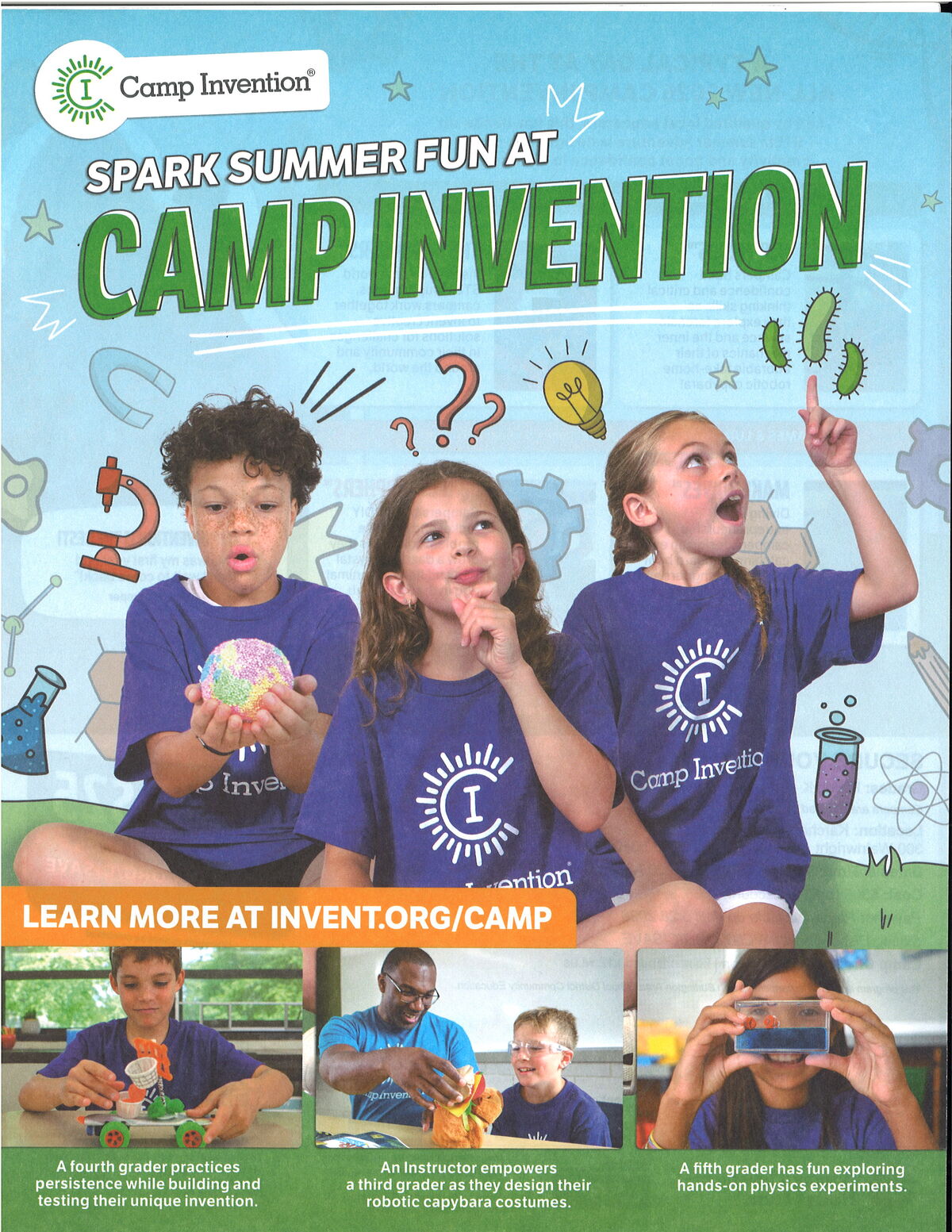 It’s time to reserve your child’s summer spot for Camp Invention! A $25 discount is available through March 31st. A paper copy will also be sent home in your child’s folder.