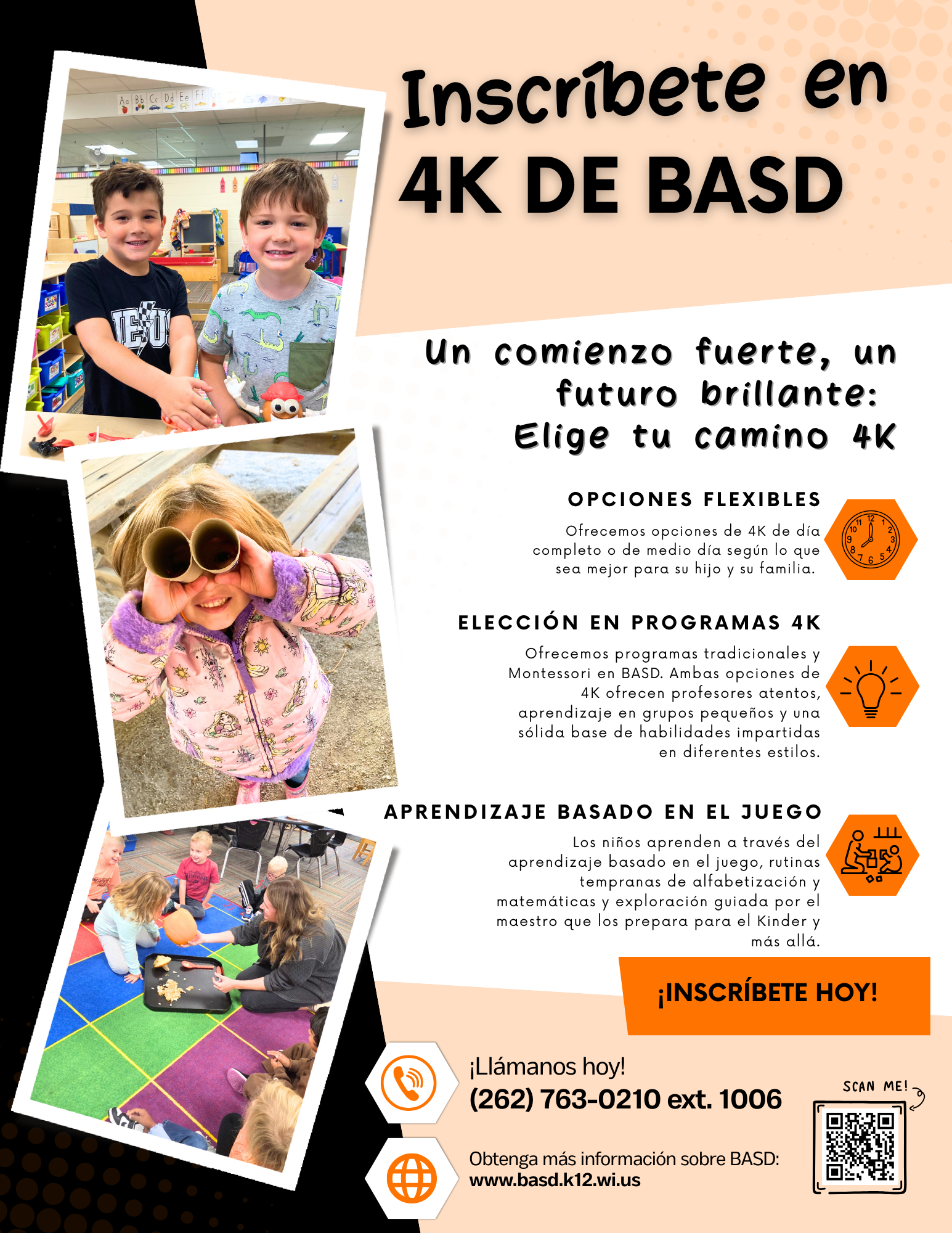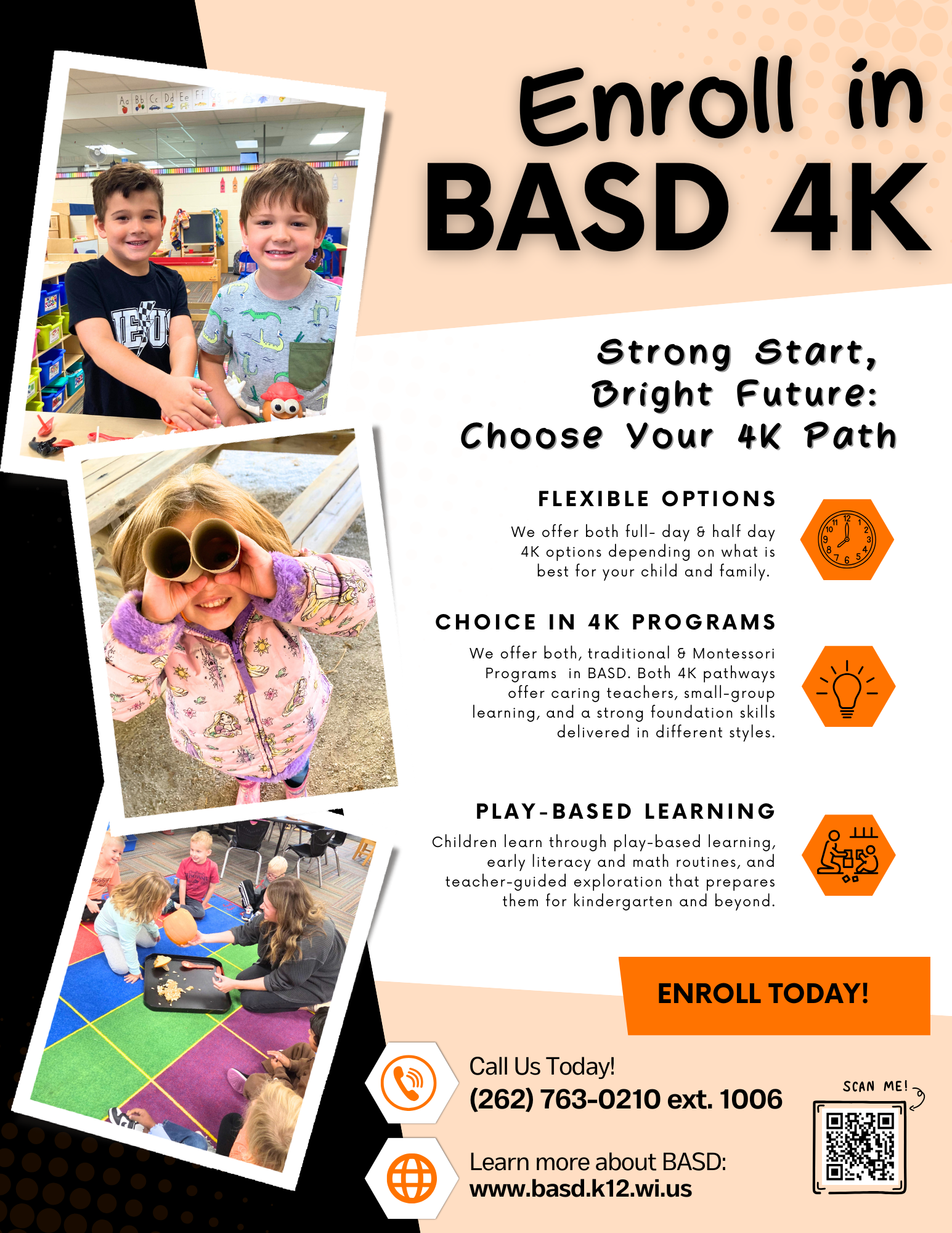 Do you have a child who will be ready for 4K? Now is the time to enroll in Burlington Area School District’s 4K program! BASD offers flexible full-day and half-day options, caring teachers, and engaging play-based learning designed to build a strong foundation for kindergarten and beyond.