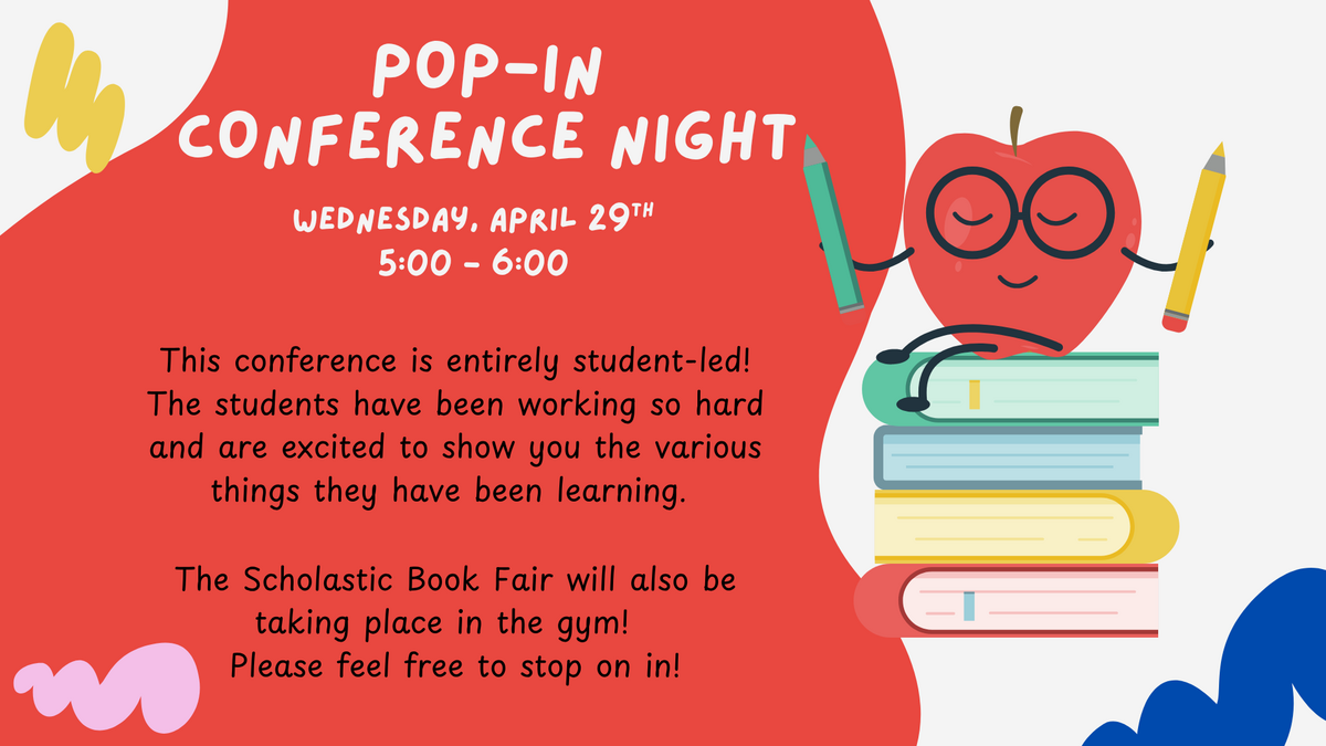 Feel free to "pop in" during 5-6:00pm for our student-led conferences! The Scholastic Book Fair will also be available during this time in the gym.