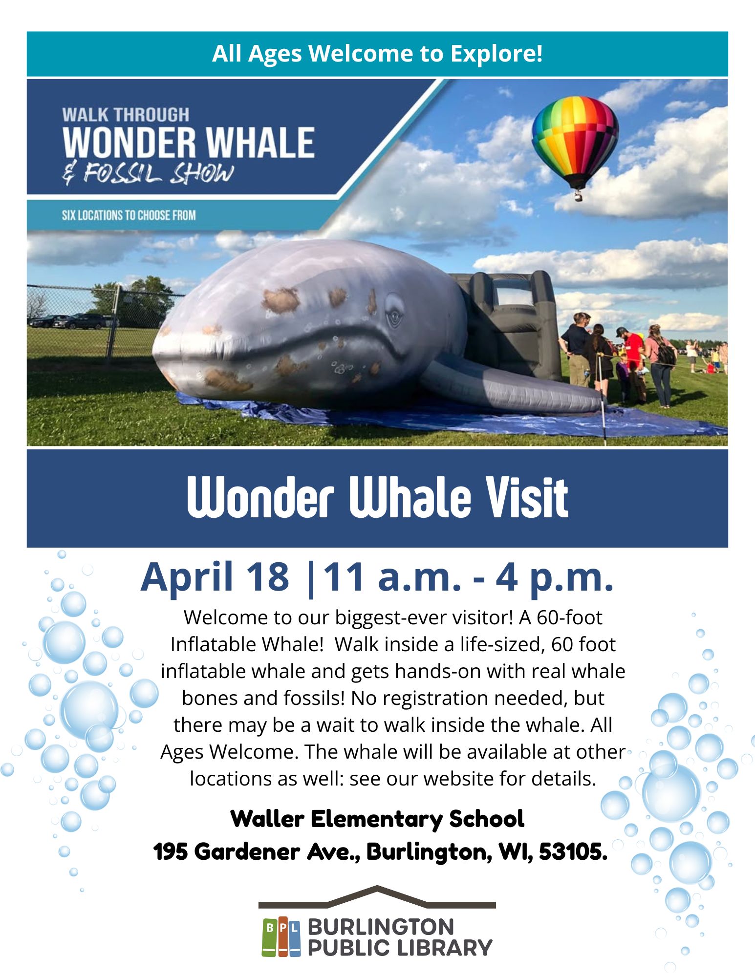 Burlington Public Library Presents: Wonder Whale Visit! 🐋 📅 Date: Saturday, April 18th 🕚 Time: 11:00 AM – 4:00 PM 📍 Location: Waller Elementary School The public library is hosting the Wonder Whale and Fossil Show at Waller! All ages are welcome to explore and walk inside an inflatable whale! |