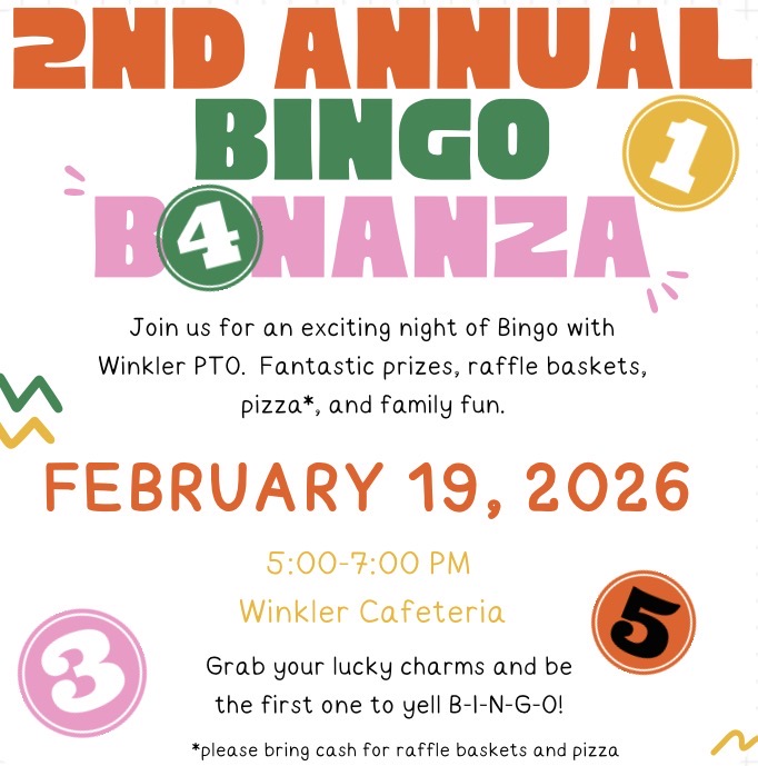 This event can't run smoothly without the wonderful help of our PTO and our kind, generous families. Please consider donating toward PTO raffle baskets, concessions, prizes, or volunteering a bit of your time to help. Cash or checks (made out to Winkler PTO) will be accepted at the Winkler office or during Bingo Night.