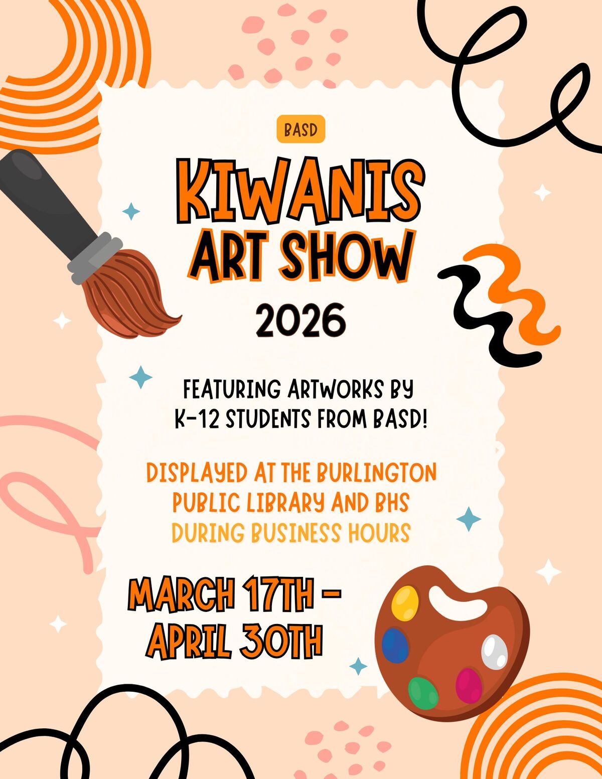 The 2026 Kiwanis Art Show will feature BASD students in grades KG–12 from March 17 through April 30 at BHS and the Burlington Public Library. We hope you enjoy viewing the incredible artwork created by our students!