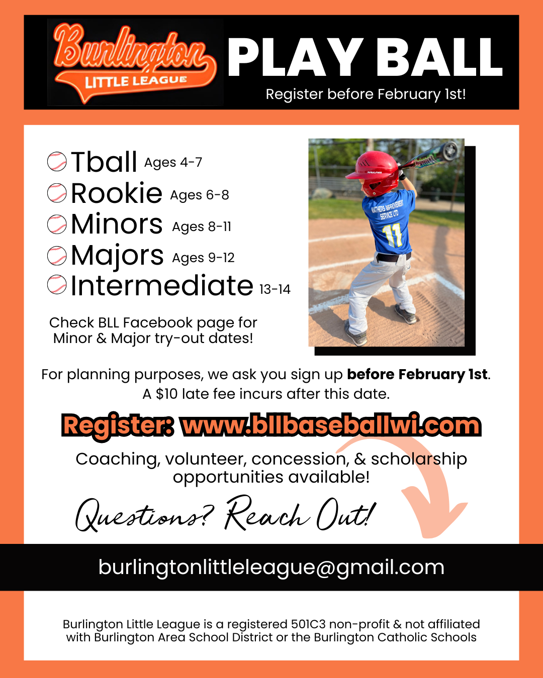 Burlington Little League T-Ball and Rookie registration is open until March 31st!