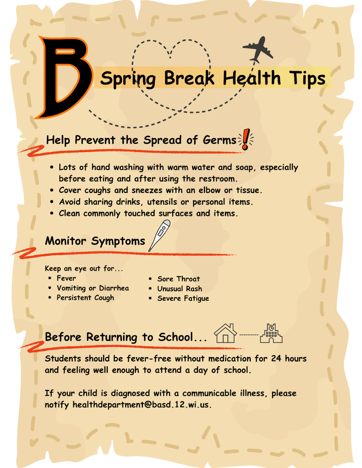 As we head into spring break, we want you and your family to have a fun and safe time. Traveling, getting together and changes in routine can sometimes increase the spread of common illnesses like colds, the flu, stomach viruses and other communicable diseases. Help us keep our students and schools healthy using the following tips. |