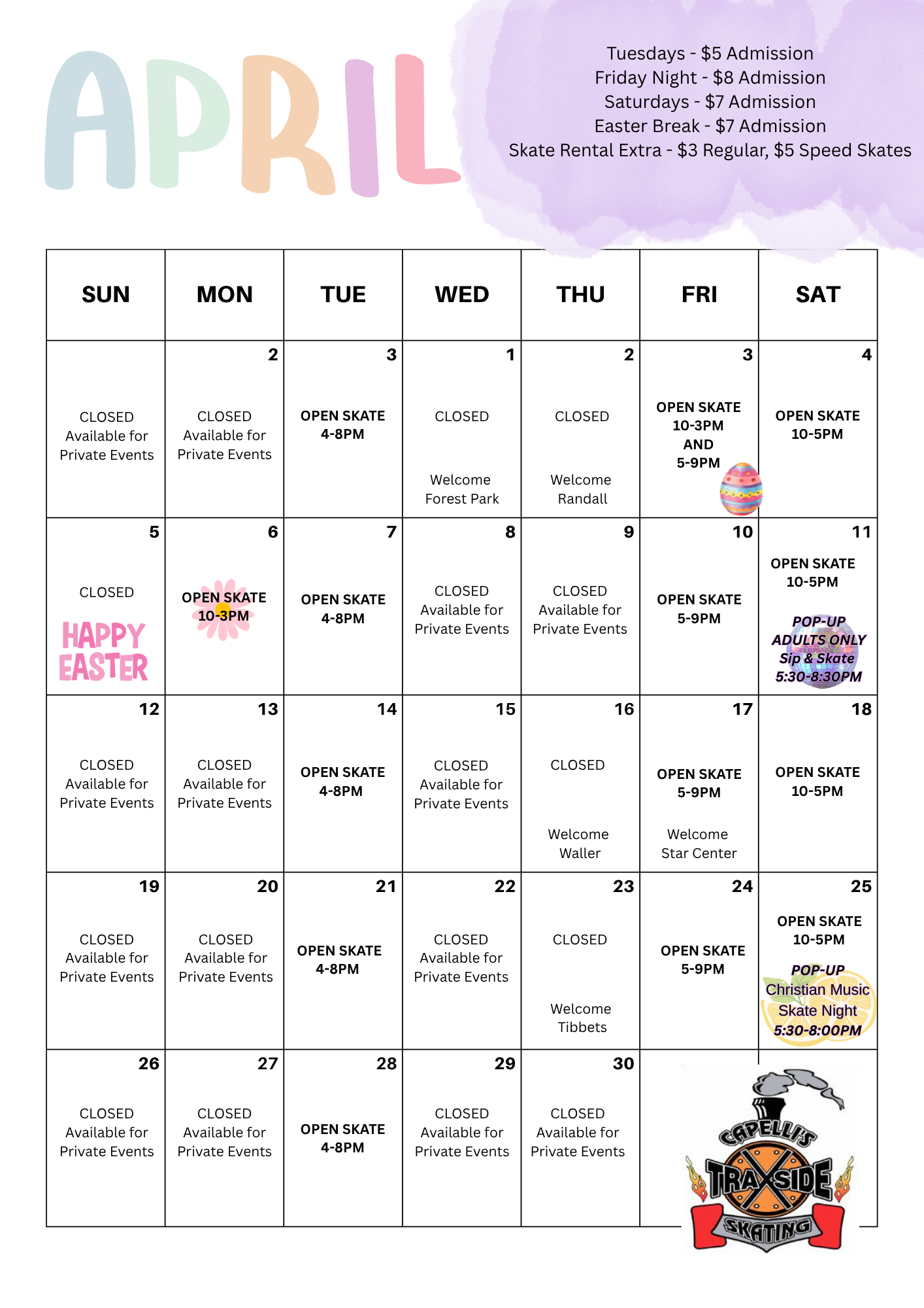 We hope you can join us for a fun night of roller skating at Traxside! This is a fundraiser for Waller, and a portion of each admission will be donated back to the school. The event will take place on Thursday, April 16, from 5:30–8:00 PM. |