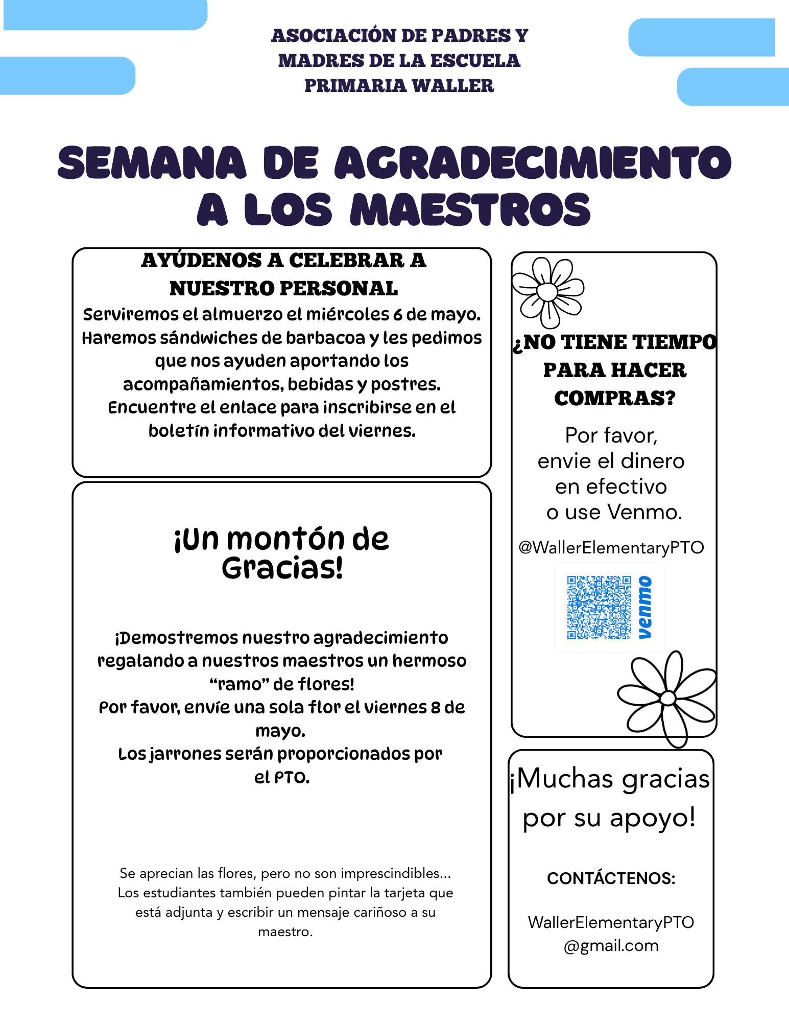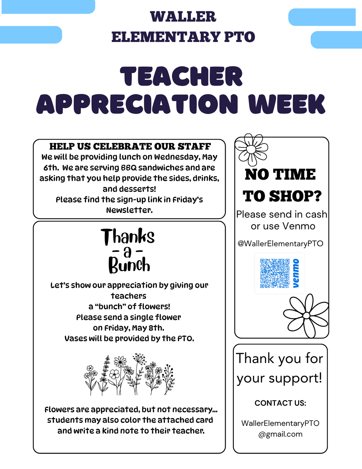 See below in regards to information for the upcoming Teacher Appreciation Week! Thank you in advance for helping out.